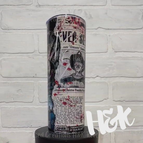 Freddy Kreuger newspaper mugshot. This is a 20oz double-walled stainless steel tumbler. It will keep your drink hot or cold for hours!! Each cup comes with a locking lid and a straw. The image is printed using sublimation. All items are made to order.